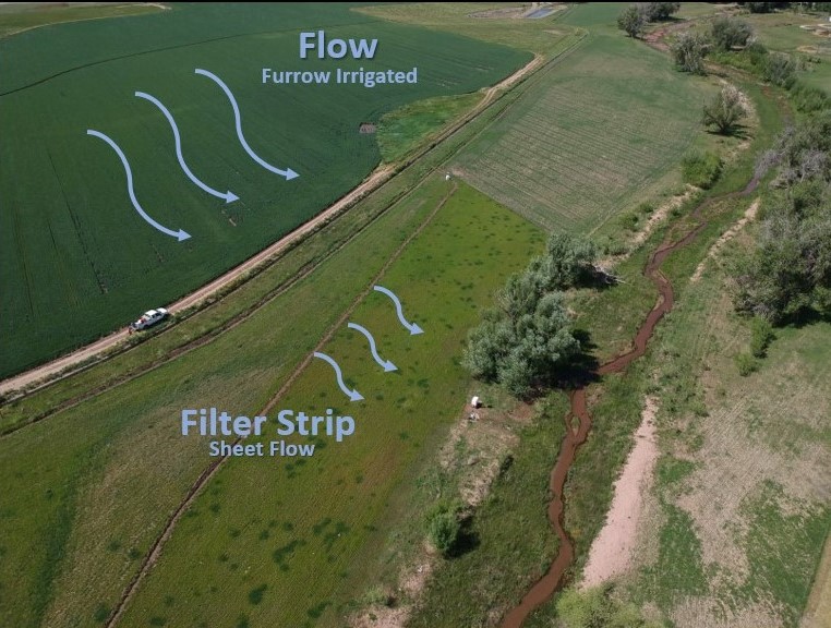 Filter strips allow water flowing out of a field to slow down and drop sediment and nutrients before it enters waterway (source, NC State SERA17)